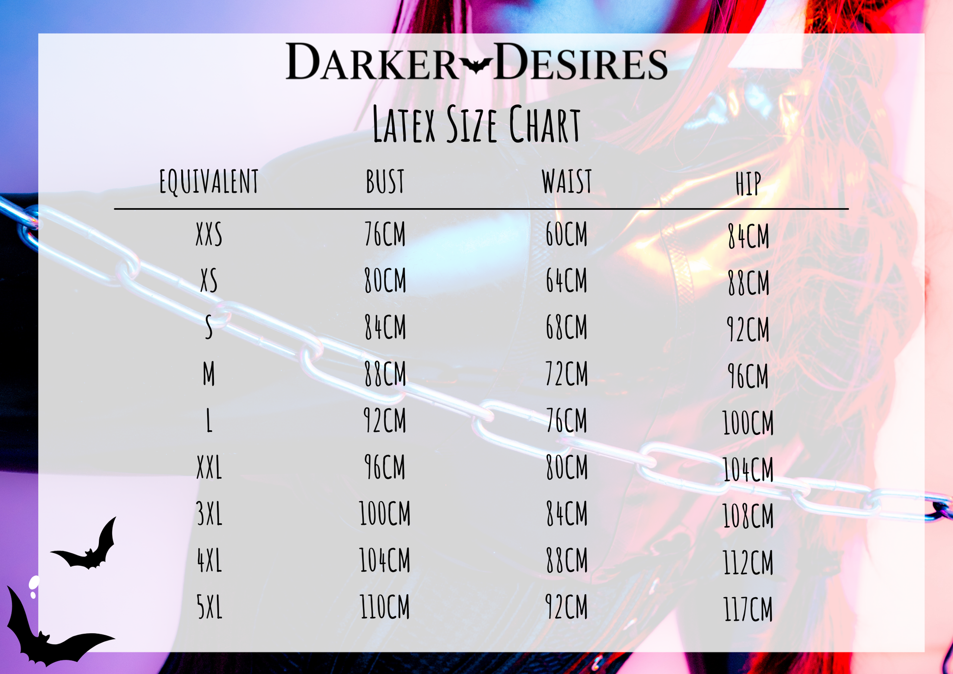 Care Instructions: Clean your latex garment with lukewarm water after wear & BeGloss or mild soap, then hang to dry. Store away from heat, humidity, and direct sunlight in plastic or tissue paper. Use silicone-based spray for extra shine.